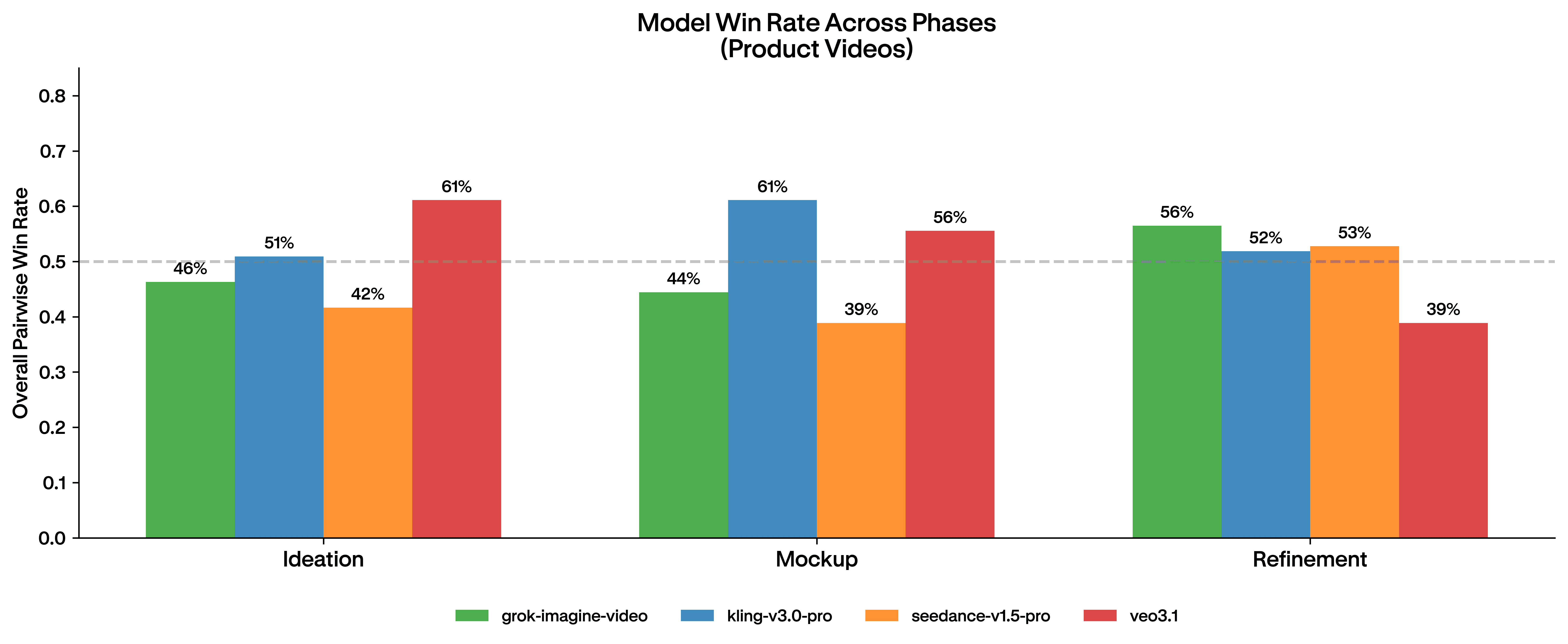 By refinement, every major theme flipped positive. Motion Quality (+16), Usability (+23), Realism (+20), Prompt Adherence (+11). Win rate: 56%, ahead of every other video model we tested. Evaluators kept reaching for the same four words: organic, smooth, natural, controlled.
