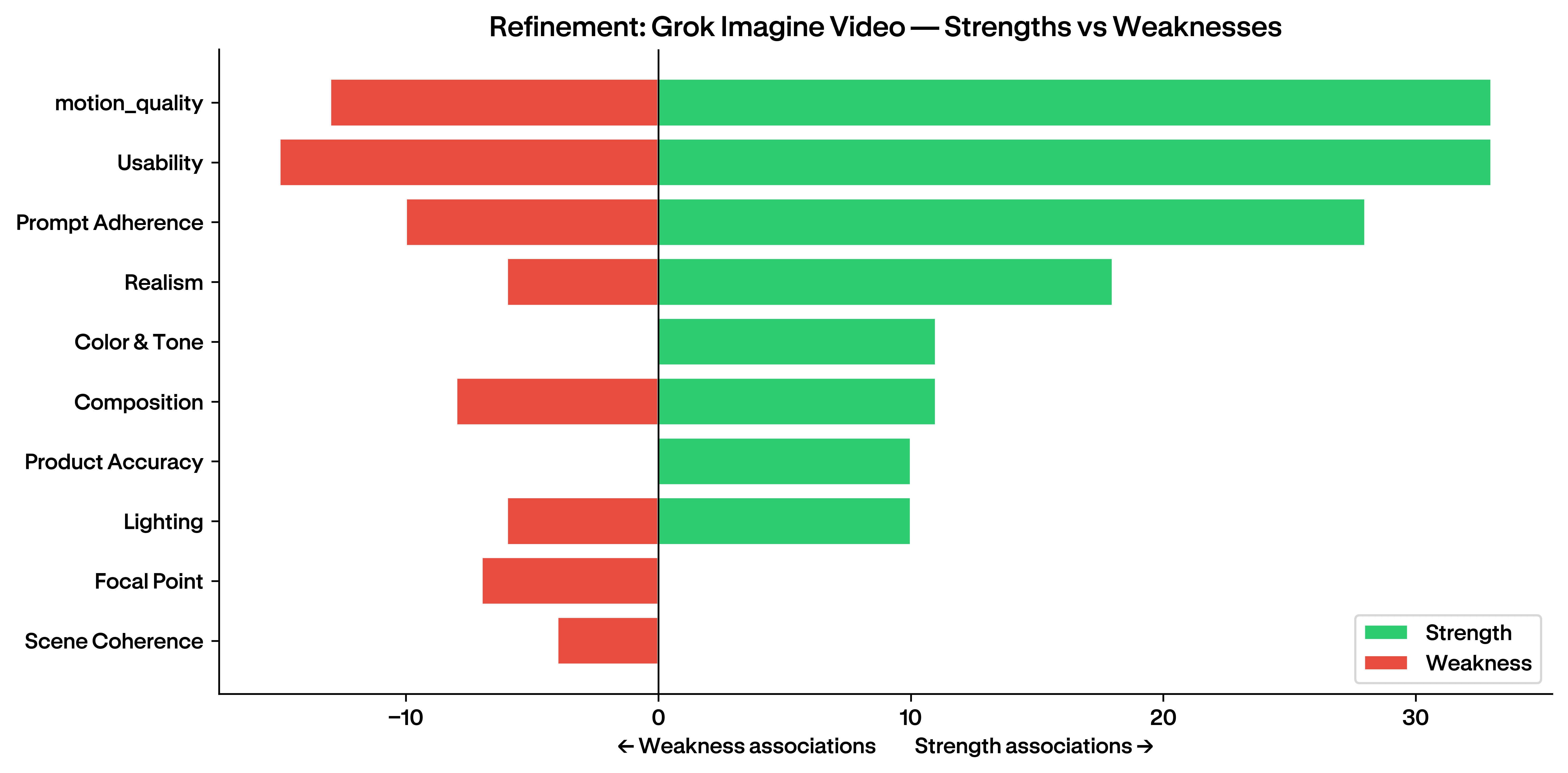 Refinement is the phase where creatives stop generating and start polishing. Smooth camera moves, natural product framing, controlled lighting transitions. Grok handles all three with consistency. Motion quality (30 vs 18 across competitors), usability (24 vs 18), and lighting (17 vs ~3) all sit clearly in the green.
