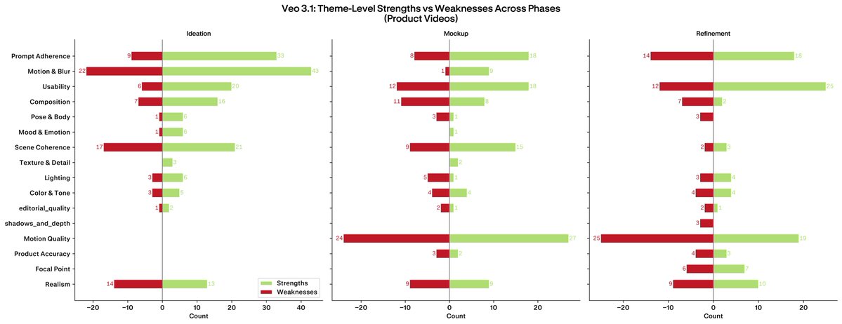 One flag even at its peak: Motion & Blur criticism showed up in roughly 27% of evaluations. Even the best phase for Veo carried a persistent motion quality weakness. Worth noting for video-heavy briefs.