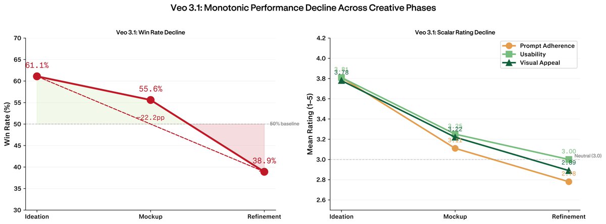 What makes this unusual is the shape of the decline. Veo 3.1 is the only model in the experiment that degraded monotonically across every single metric as phases progressed. Grok Imagine, Kling AI, and ByteDance's Seedance 2.0 each improved in at least some dimensions by refinement. Veo got worse across all of them.